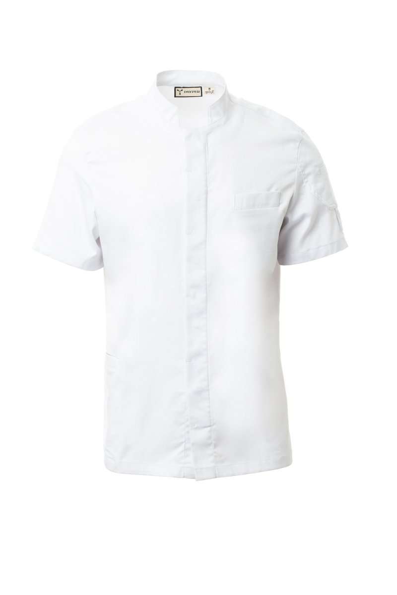 Giacca da cuoco con collo alla coreana, realizzata in twill di cotone e Lycra® T400®, con ottime proprietà elastiche e traspiranti. Chiusura centrale con bottoni automatici. Manica corta con orlo, lunetta in tessuto a rete nel sotto giromanica, per agevolare la traspirazione. Iconica toppa sagomata sulla spalla sinistra, con ricamo ad elica tono su tono, provvista di taschino porta penne. Taschino al petto e pratica tasca porta smartphone in vita. Spacchi verticali nel fondoschiena per facilitare i movimenti.