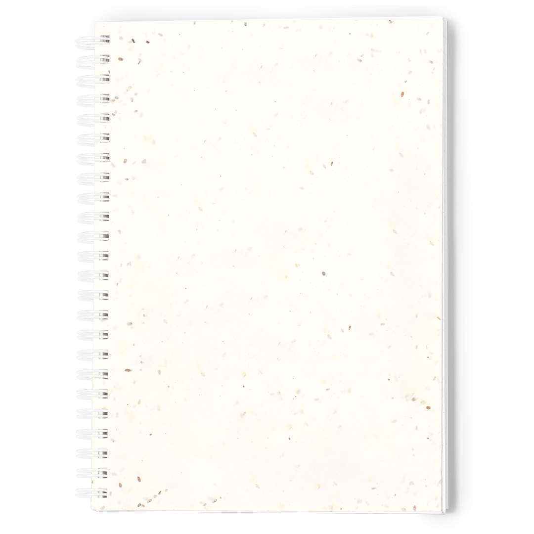 Taccuino con raccoglitore ad anelli e copertina morbida in carta di semi. Con 80 fogli bianchi lisci. Le copertine includono semi di petunia, rendendo la carta piantabile alla fine della sua vita utile. Include istruzioni per la semina sul retro della copertina e viene fornito in un sacchetto individuale di carta riciclata.