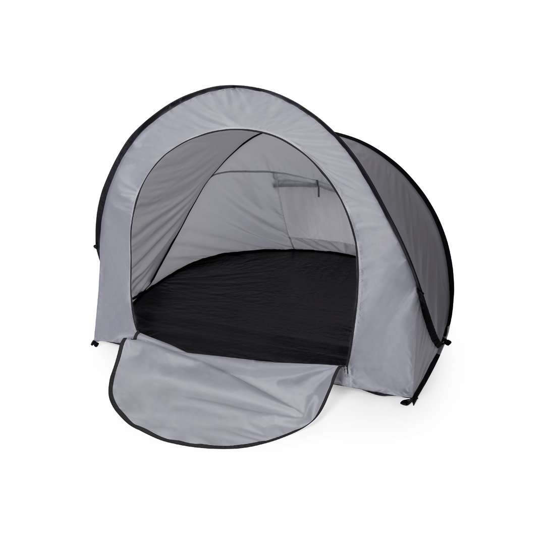 Tenda automontante, basta estrarla dalla copertura e si dispiega automaticamente. Realizzata in resistente poliestere RPET, con struttura in metallo e dettagli neri. Ampia porta d'ingresso, con chiusura a zip e doppia maniglia interna ed esterna. Finestra sul retro con zanzariera, chiusura a velcro e tenda avvolgibile con cordino e cinghia di fissaggio. Ideale per 2 persone e facile da piegare. Confezionata in una custodia coordinata, con etichetta RPET all'esterno.Il materiale RPET è realizzato con plastica riciclata per incoraggiare il riutilizzo dei rifiuti plastici e contribuire alla sostenibilità del pianeta.