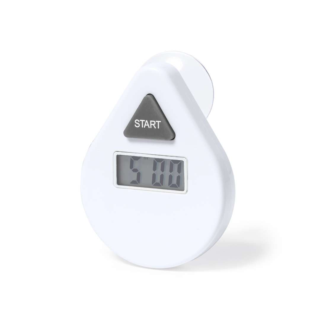 Timer in ABS resistente con finitura bianca e fissaggio a ventosa. Display LCD di facile lettura, con pulsante di controllo del conto alla rovescia (5 minuti). Alimentazione a batteria (pile a bottone incluse). Presentato in una scatola kraft individuale, con manuale di istruzioni in inglese e spagnolo.