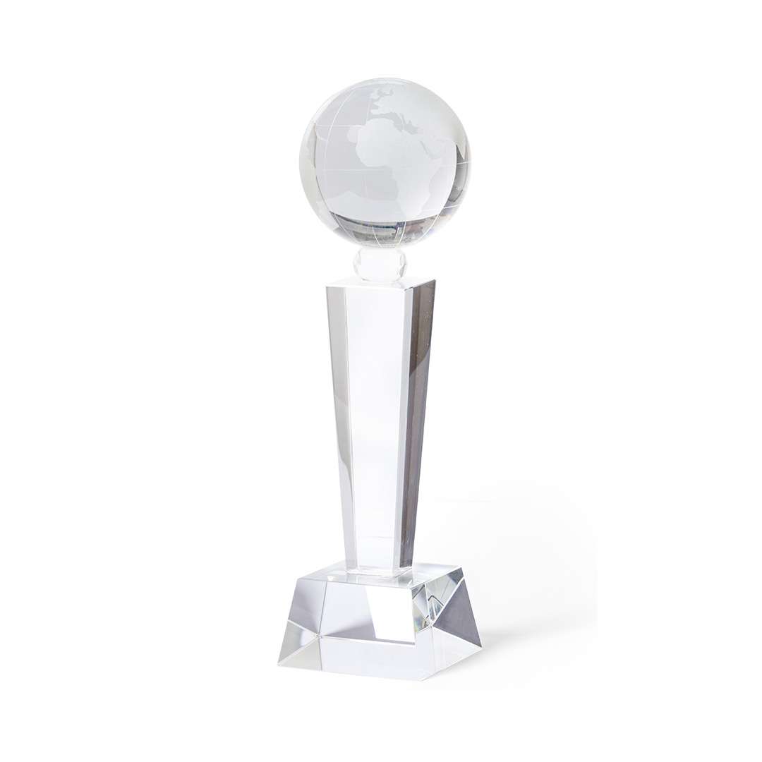 Trofeo in vetro con riproduzione del pianeta terra e base resistente. Appositamente progettato per la stampa laser e confezionato in una custodia protettiva in cartone resistente con chiusura magnetica e interno in schiuma fustellata.