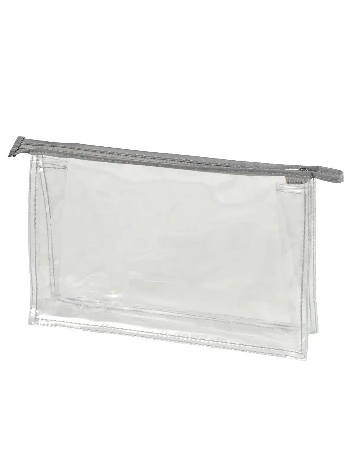 100% plastica trasparente 0,25 mm. Trousse con inserti in grigio, chiusura con cerniera. Dimensioni: 27 x 17 x 7 cm, capacita': 2 litri, possibilita' di serigrafia a un colore sul fronte: 15 x 8 cm.