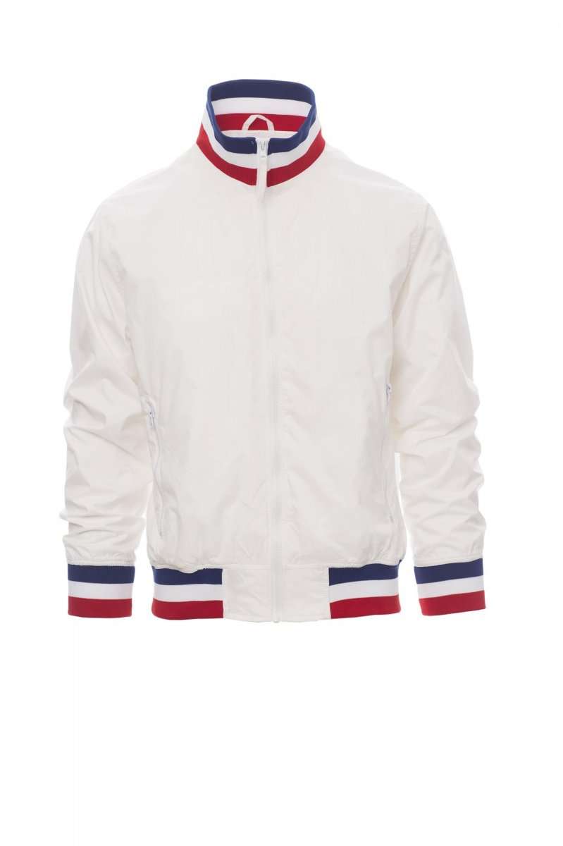 Giubbino da uomo, zip bianca in plastica con cursore in metallo, con colletto, polsini e vita in rib con colori bandiera, due tasche esterne interno: non imbottito, fodera in drytech, una tasca interna e zip per agevolare stampe e ricami.