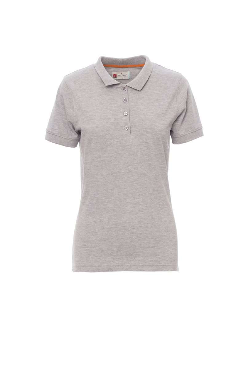 Polo sfiancata da donna a manica corta con 4 bottoni in tinta effetto perlato, colletto e bordo manica a costine, spacchetti laterali, cuciture del collo coperte con nastro a contrasto, cuciture stretch, nastro di rinforzo laterale, rinforzo sagomato retro collo.