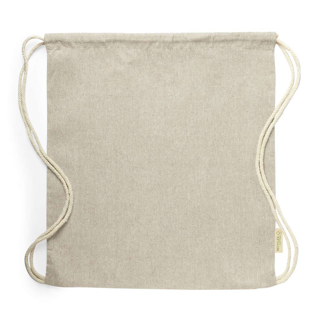 Sacca della linea natura in cotone riciclato da 120 g/m2. Stringhe autobloccanti in cotone, con etichetta ecologica sul lato e disponibili in un'ampia gamma di colori naturali. Resistenza fino a 9 kg di peso.